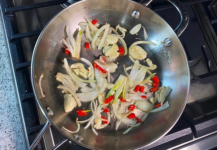Heat the olive oil (any oil you prefer using) on a wide/deep saucepan on a medium heat. Add the onion, garlic, black pepper and in my case I used Bird’s Eye peppers for a bit of heat. You may use any hot pepper you like or can source and in the amounts you can tolerate. Should you not enjoy spicy foods, this is optional. Reduce the hat to low and cook for about 4 minutes.