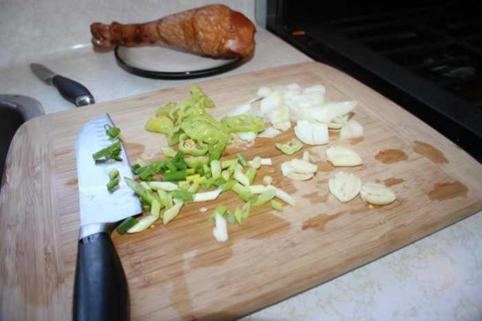 Once peas are tender, remove smoked turkey leg and set aside to cool. Add prepared vegetables, corn, tomato paste, and Grace cock soup mix to the pot. Add more water if needed to cover the vegetables. Bring to a boil.
