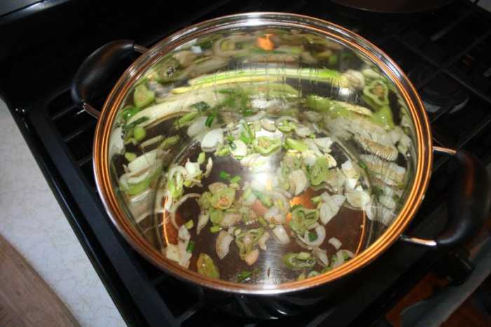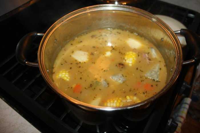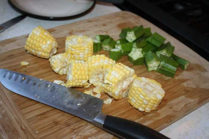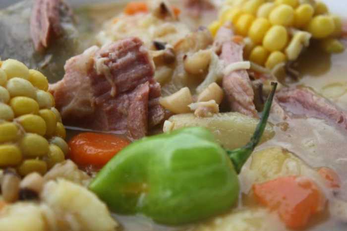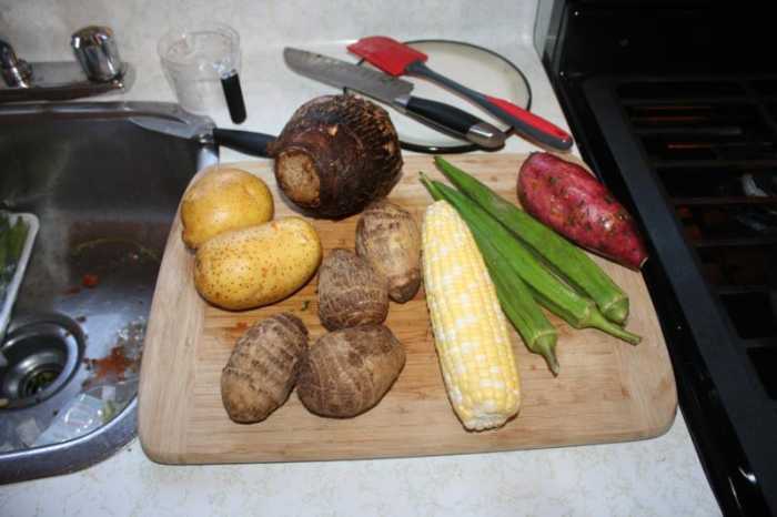 Simmer uncovered for 45–60 minutes, or until peas are tender. Meanwhile, peel and cube the dasheen, eddoes, potatoes, and sweet potato. Remove stems from okra. Cut corn into pieces and rinse well.