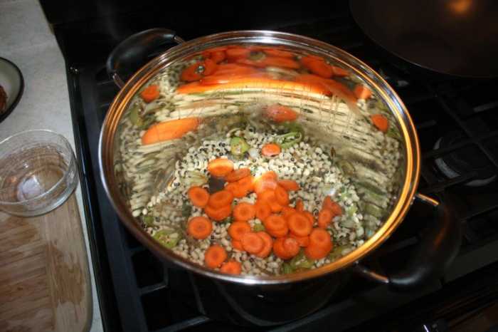 Stir in black eye peas and carrot. Add smoked turkey leg and pour in 10–14 cups water. Add scotch bonnet pepper, salt, and black pepper. Bring to a boil, then reduce to a simmer.