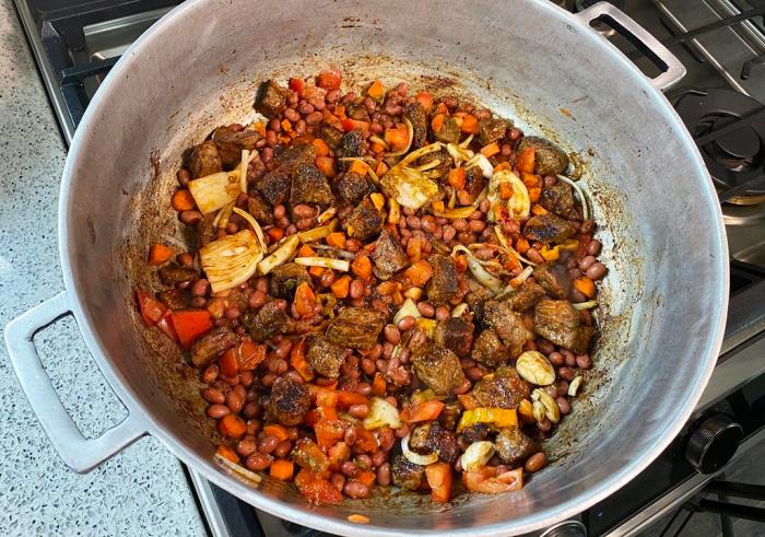 Depending on how large you cut the beef pieces (any cheap cut of beef will work), it may be somewhat tender after one hour and 10 minutes, so it’s time to add the rest of ingredients and bring back to a boil.