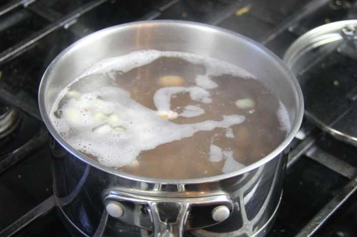 Pour in 2 cups of water and bring to a boil, then reduce to a rolling simmer. Add the remaining garlic. Add more water during cooking if necessary.