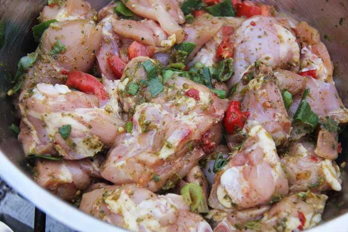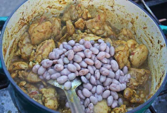 Season the chicken with salt, Caribbean green seasoning, tomato, scallions, scotch bonnet pepper, and black pepper. Mix well and allow to marinate while the beans cook.