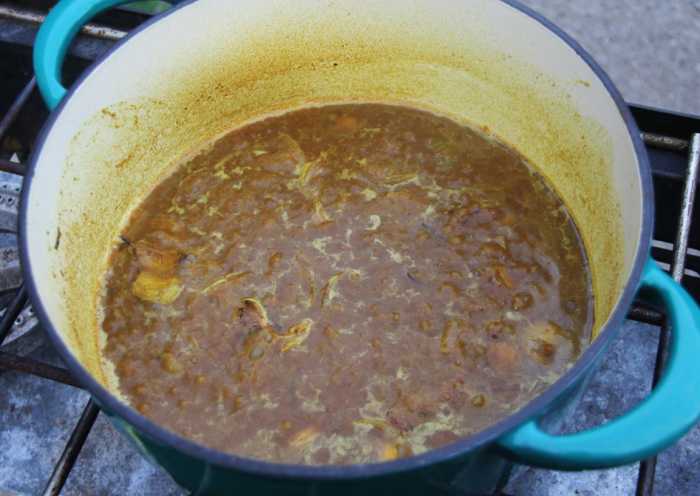 Remove the lid and cook uncovered for about 5 minutes to burn off that liquid. This step helps cook-off the ‘rawness’ of the curry.
