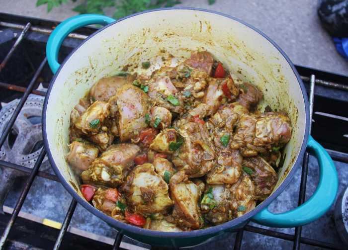 Add the seasoned chicken and stir well to coat each piece in the curry base. Cover the pot. After about 3 minutes, the chicken will release its own liquid.