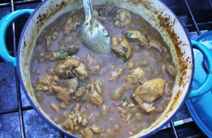 Turn off the heat and stir in the chadon beni or cilantro. Serve hot with coconut rice or rice and peas.