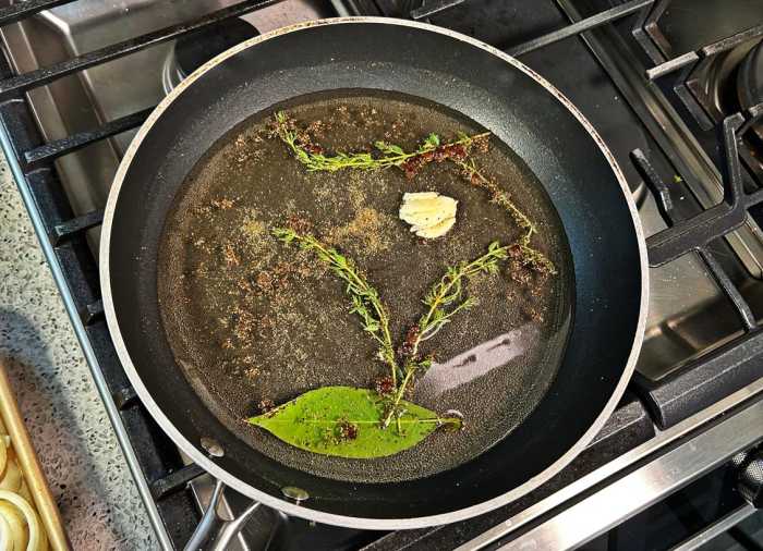 Photo by Chris De La Rosa Place the vinegar, water, thyme, sugar, and black pepper into a saucepan over low heat.