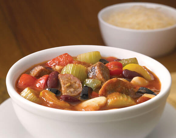 Grill Italian sausage according to package directions; cut into half moon slices and set aside. In soup kettle, sautÈ onion, celery, sweet pepper and garlic in oil until tender. Add sausage and remaining ingredients; bring to boil. Reduce heat; cover and simmer for 20 minutes or until flavors are blended.