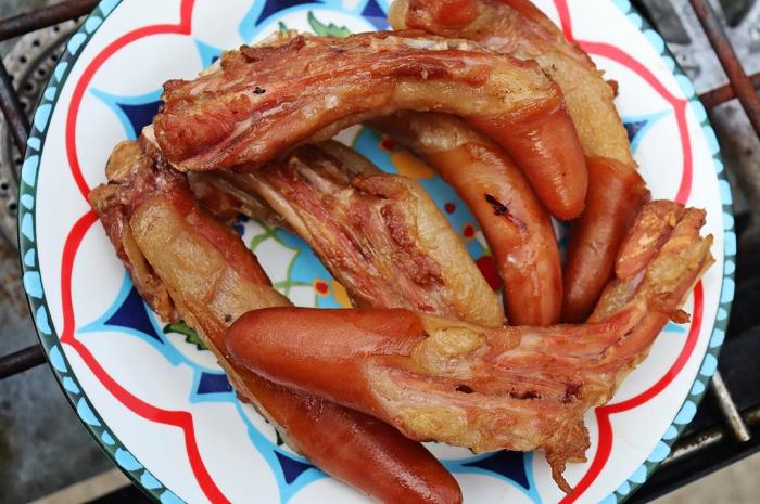 I used my Traeger pellet smoker with applewood pellets. You may use an offset smoker, propane or charcoal bbq if you wish. For the propane and charcoal bbq you’ll need to grill indirectly and employ the use of smoke pouches (essentially wood chips wrapped with foil, with tiny holes so when the wood chips burn, the smoke will escape and flavor the pigtail pieces)