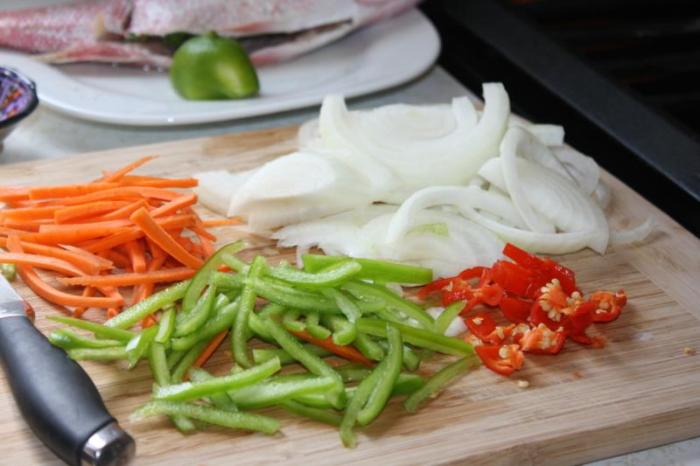 Next up it’s time to put the escovitch sauce together. Julienne the carrot, sweet pepper (use different colours if you like) and chop the onion and scotch bonnet pepper (slice thin).
