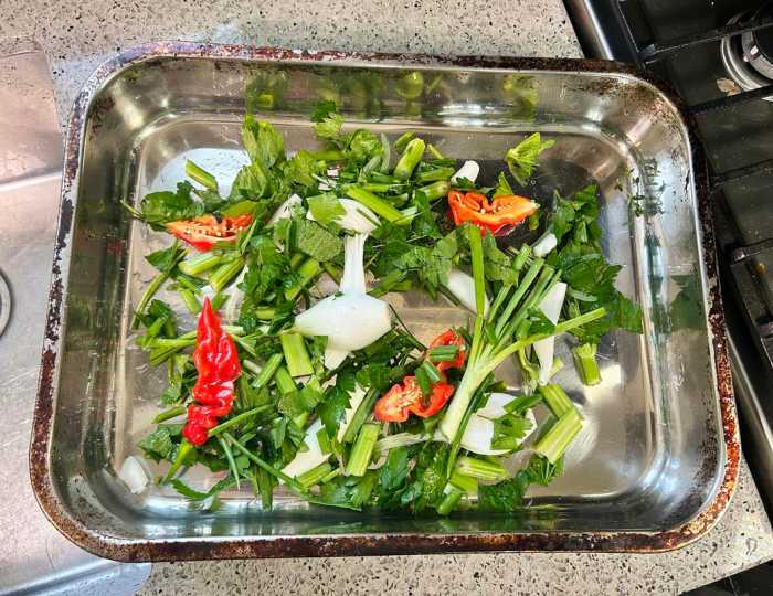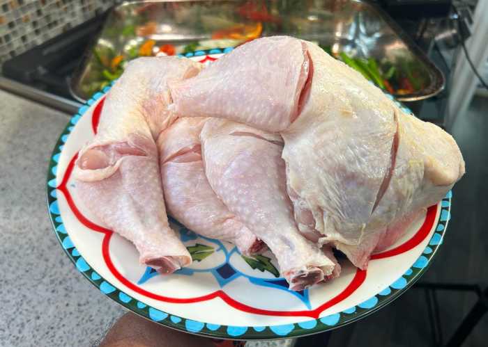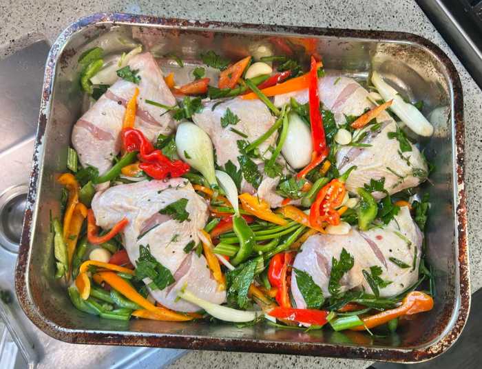 Add the chicken legs to the roasting pan and mix thoroughly with the marinade.