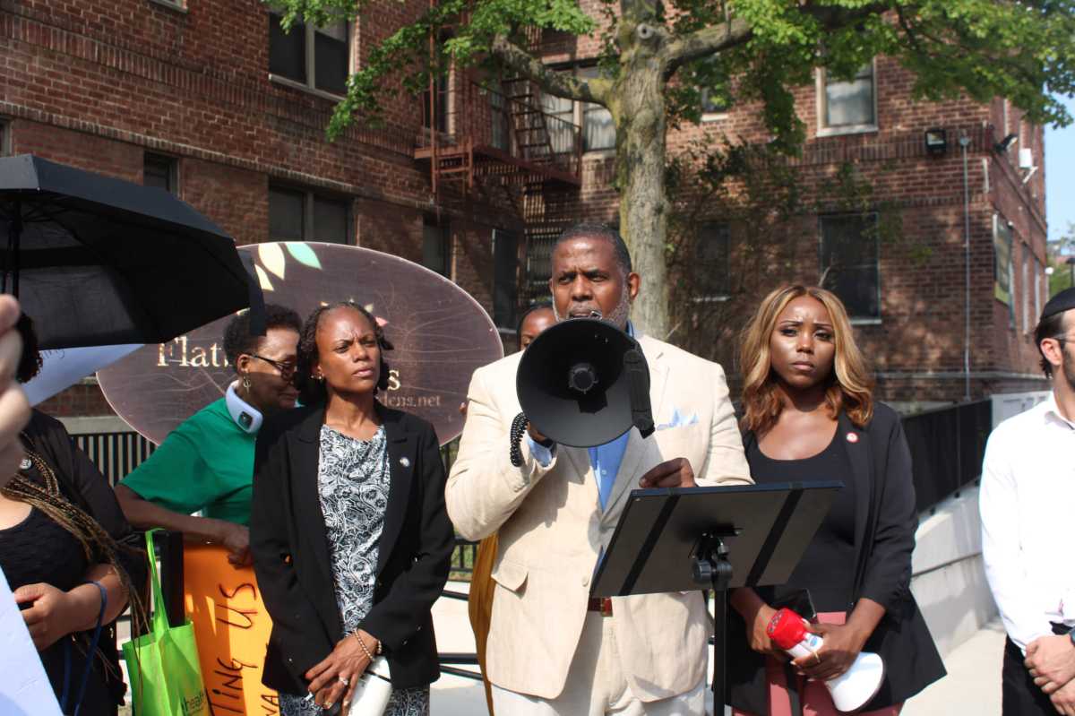 New York State Senator Kevin Parker, Assemblymember Monique Chandler-Waterman, and Councilmember Farah N. Louis, on July 28, joined scores of residents in front of the Flatbush Gardens Management office, 3301 Foster Ave., Brooklyn, to denounce unhealthy living conditions in the housing complex.