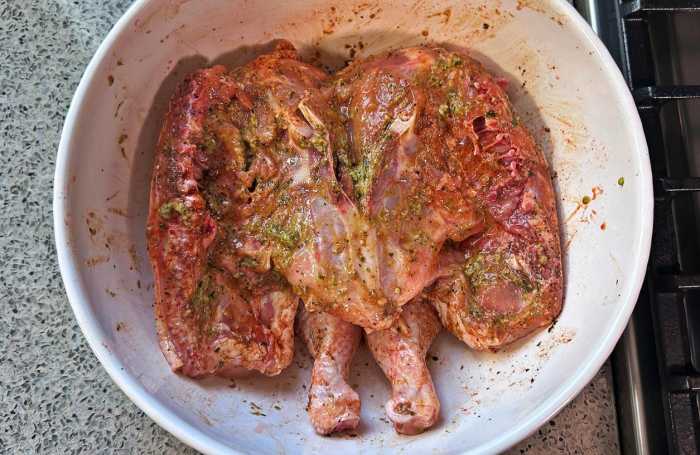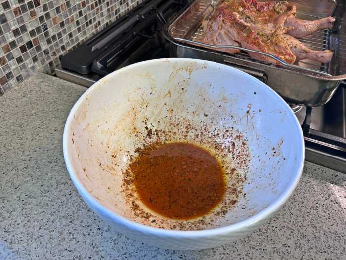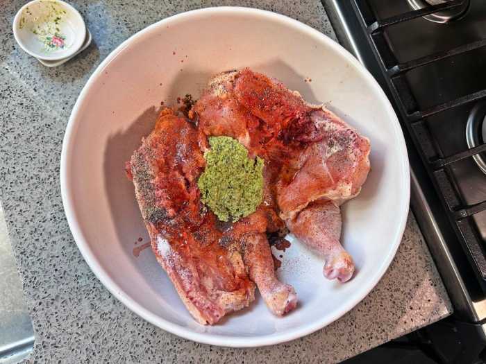 Rub the marinade evenly over the chicken and place it in the refrigerator to marinate for 4 hours. Reserve any marinade left in the bowl after marinating.