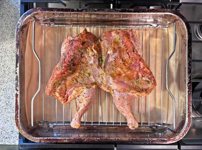 Place the chicken skin side down on the rack and roast uncovered on the middle rack of the oven for 30 minutes.