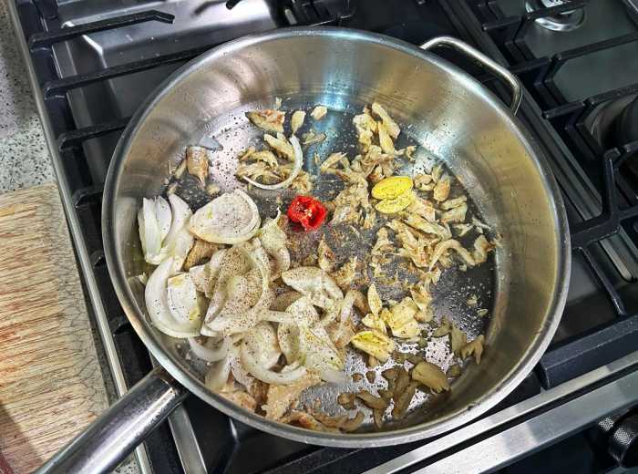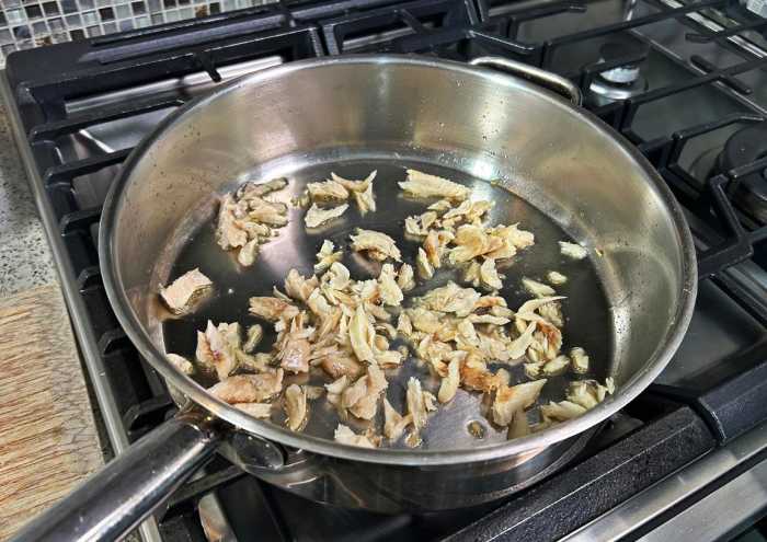 Heat the oil on a medium flame in a deep pan and add the prepared salted cod. Reduce the heat to medium-low and cook for 3 minutes.
