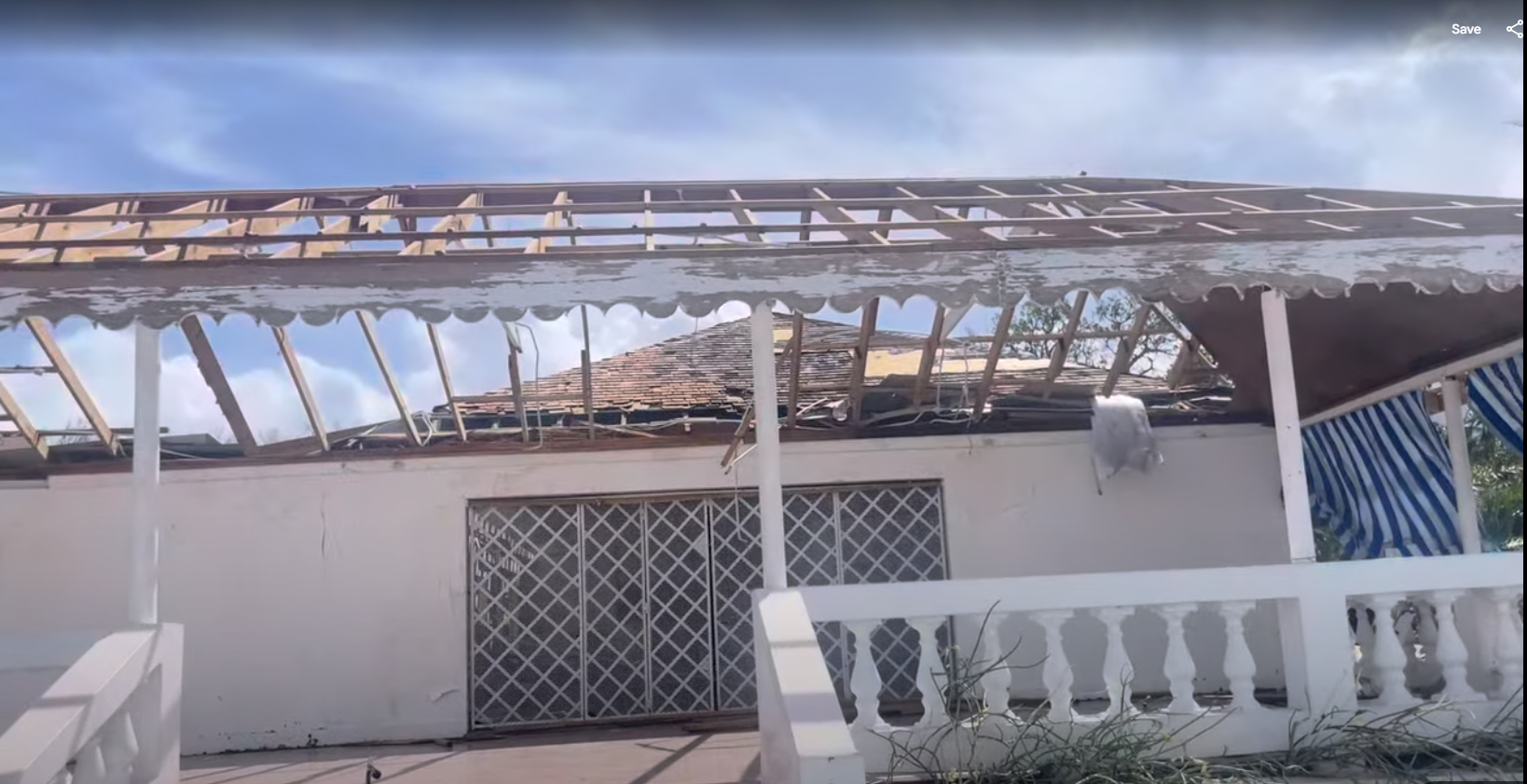 By evening, the roar faded. We stepped out and saw a different world: palm trees uprooted, the entire zinc roof ripped off the building and blown 100+ feet away, all vegetation behind the Airbnb destroyed, paint stripped from the back balcony, and blocks of debris everywhere.